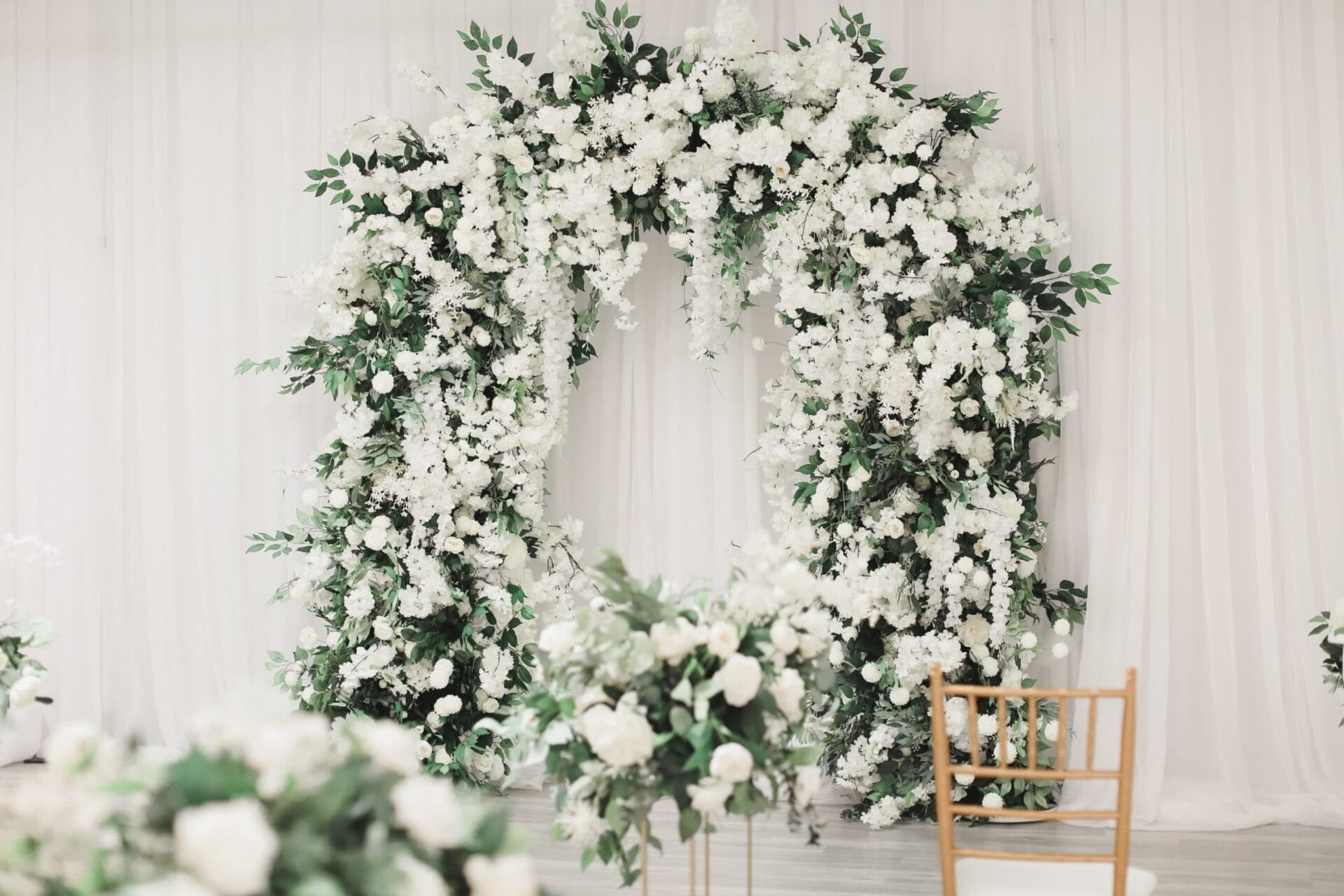 Stands may be changed depending on availability, but the setup is very similar. Included decor onsite: floral arch, floral aisle markers, chiavari chairs, standard signing table with white tablecloth and the welcome sign with easel.